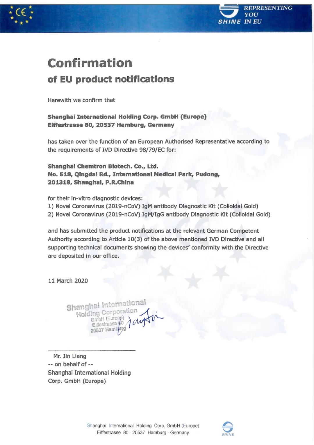 該兩款產品均符合歐盟體外診斷器械指令98/79/EC。至此,凱創生物兩款新冠試劑盒均已獲得CE標志。